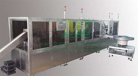(4)该机采用韩国世宗双阀和多功能软件控制系统实现加药喷雾,两套100头插入式热风烘干器,一次能同时加取100个复合帽的输帽装置,一台全自动真空补偿式真空压盖机,以及能同时抓取100支成品管的取管装泡沫托机构,取管后将其插入泡沫包装托盘机构,将这些机构动作采用可编程程序控制和气动机构执行,即可全自动完成真空采血管BCA促凝剂加药、烘干、加帽、抽真空压盖、取管、装托盘的全部工序。该机具有自动化程度高、生产效率高、性能稳定、故障率低、操作简便、维护费用低等特点。